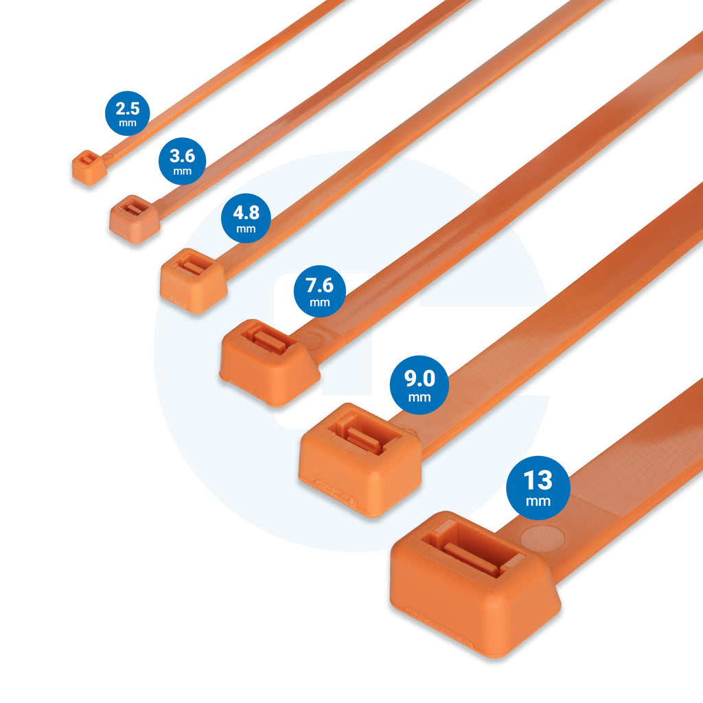 High quality orange cable ties / Colour: Orange / Material: Nylon PA66 / Working Temp: -40°C to +85°C / Length: 100mm - 780mm / Width: 2.5mm - 9.0mm / Tensile Strength: 8kg - 79.4kg / Max Bundle Diameter: 22mm - 228mm / Pack Quantity: 100pcs / Self Extinguishing Class: UL94V2 / ROHS Compliant / Zero Halogen