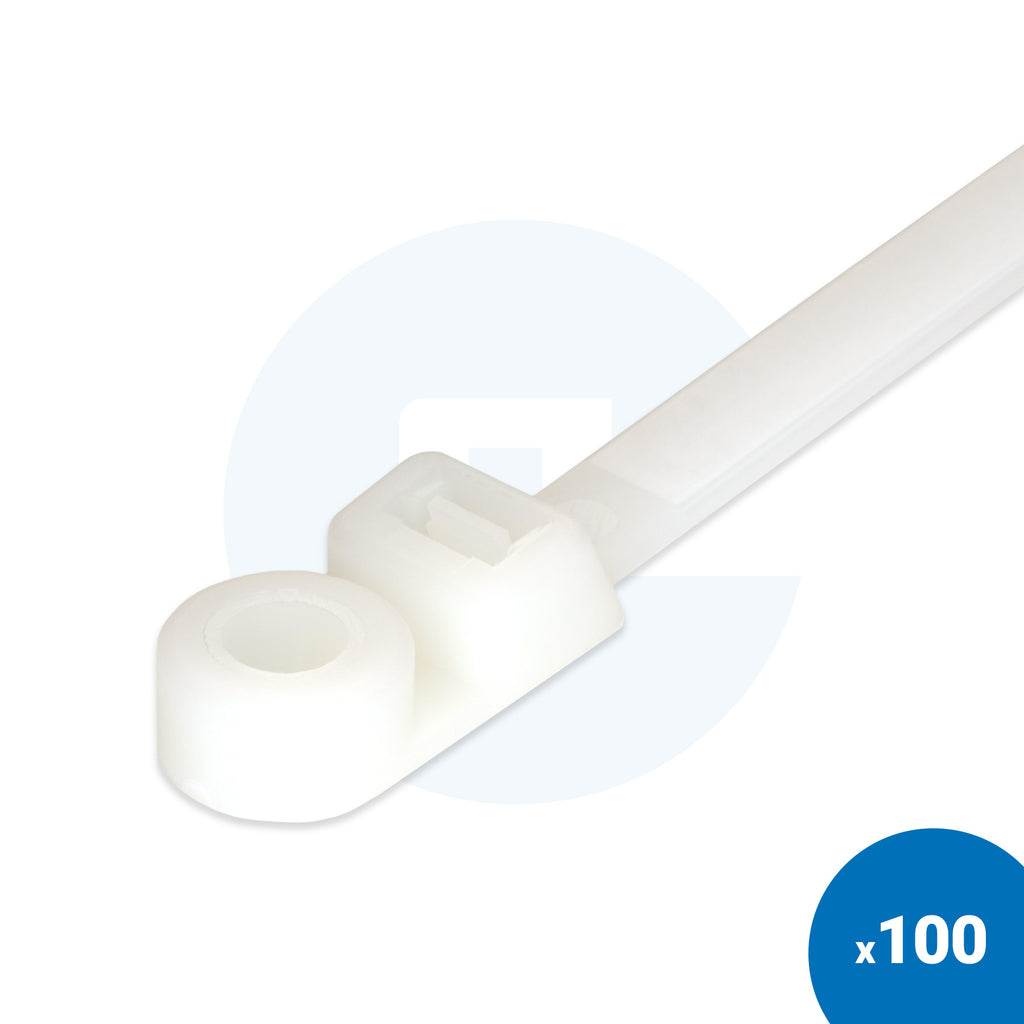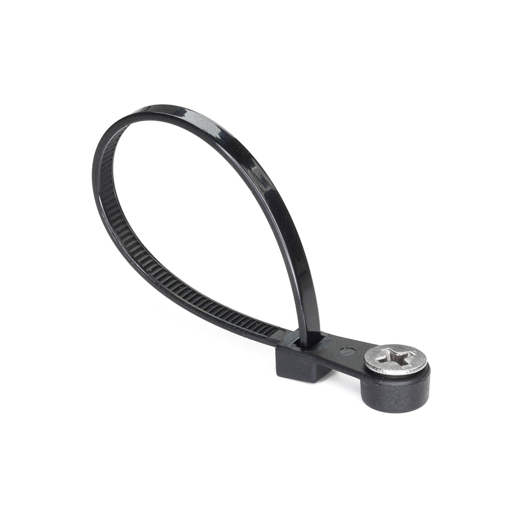 Cable ties with a screw mountable hole above the head. Ideal for fastening bundles of cable, hoses and pipes before fixing securely with a screw. / Colour: Black / Material: Nylon PA66 / Working Temp: -40°C to +85°C / Length: 110m / Tensile Strength: 8kg - 54.4kg / Max Bundle Diameter: 22mm - 98mm / Pack Quantity: 100pcs / Self Extinguishing Class: UL94V2 / ROHS Compliant / Zero Halogen
